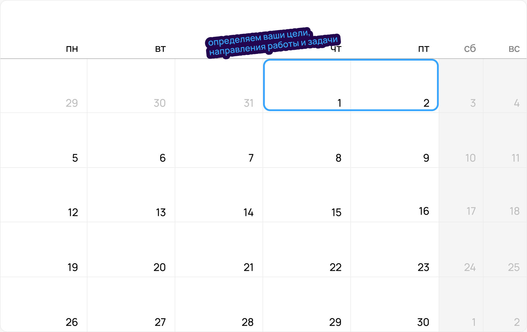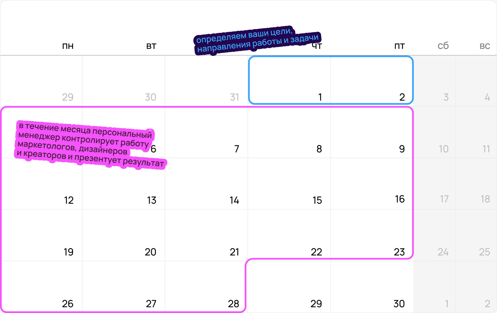 В начале каждой недели формируем список задач. В течение недели у вас есть постоянный доступ к персональному менеджеру и ходу выполнения задач. В конце каждой недели — отчет о проделанной работе.