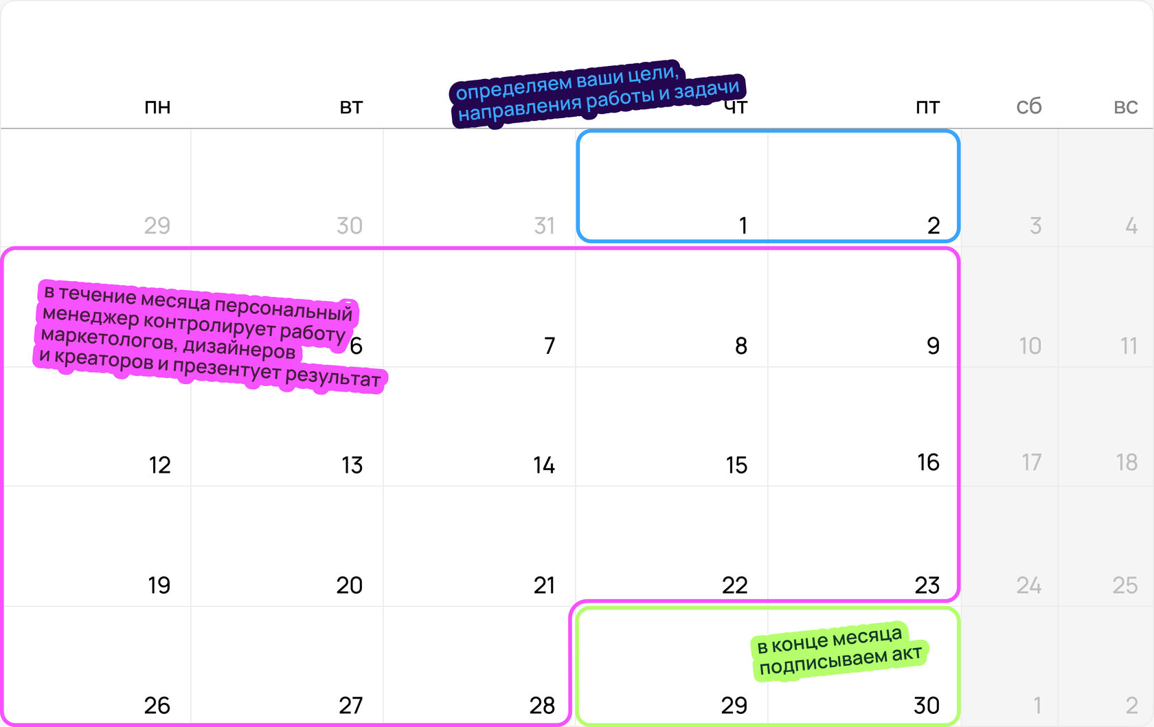 Подписываем акты и принимаем оплату после того, как выполнили все задачи — в конце каждого месяца.